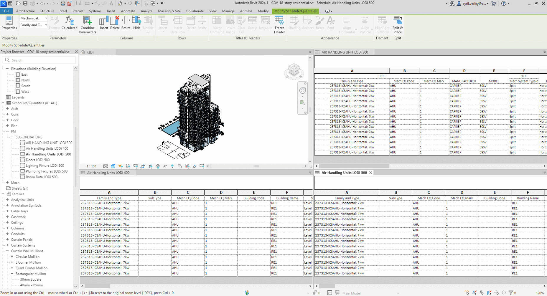 Using the LODi schedules inside each Revit model, the AEC BIM staff and owners alike can verify in real time whether required fields are filled and whether components match the approved library and include their assigned CSI classifications.